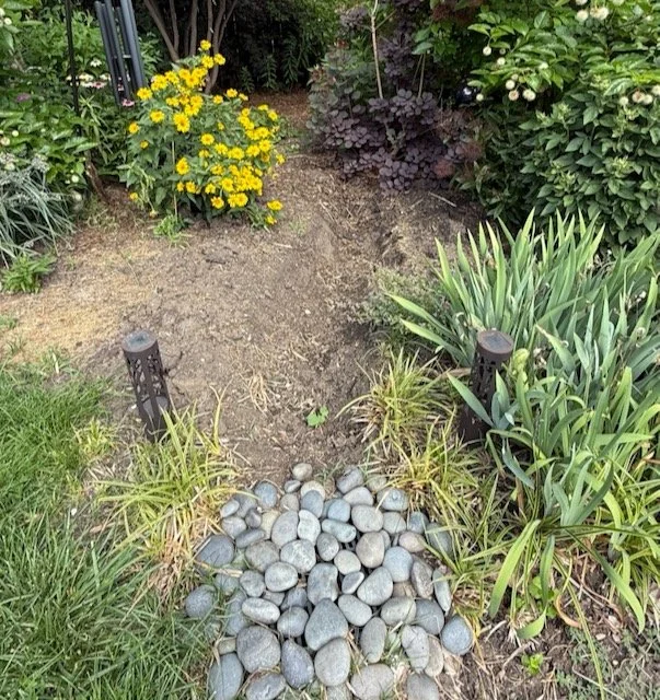 That’s a very specific little area 10 ft from property lines but 25 ft from the house. (WHY ISN’T THAT WHERE THE DRY WELL WENT IN THE FIRST PLACE? That one I cannot blame the landscaping company for. OUR TOWN’S BONKERS NONSENSICAL RESTRICTIONS PROHIBITED IT. This is a municipality that until 2014 only allowed downspouts to extend maximum 6 ft from the house. SIX FREAKING FEET. They extended it to 10 ft in 2014. Which is still decades behind modern drainage recommendations.
